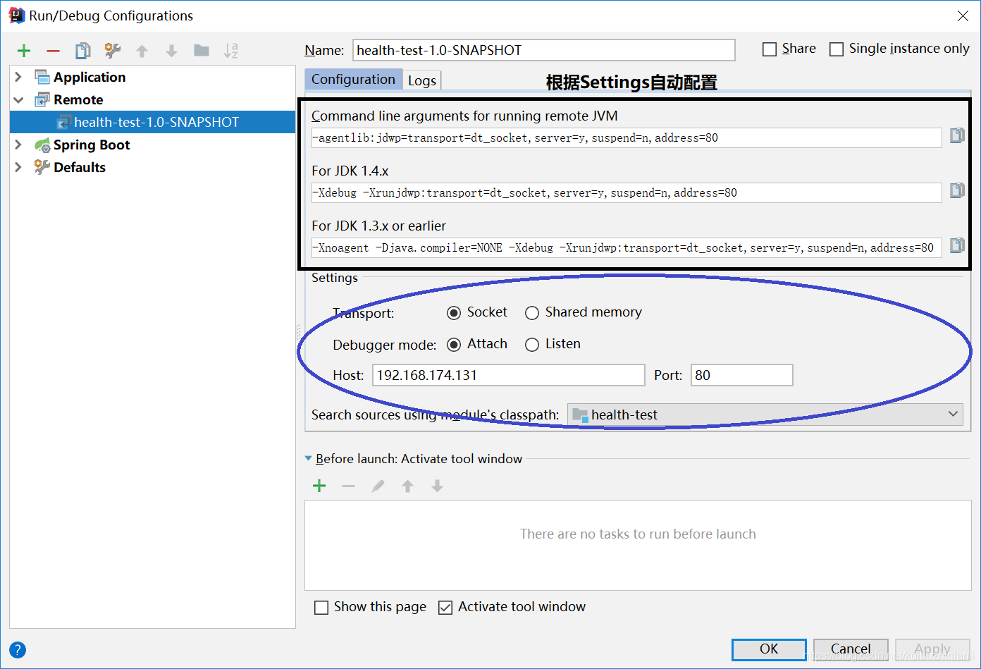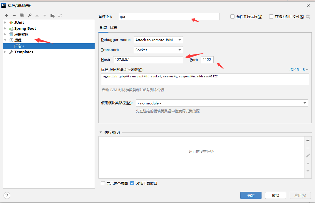 在idea中按顺序打开Run(运行) => Edit Configurations (编辑配置)=>+Remote (远程/远程JVM调试)=> Configuration(配置),设置 远程调试的项目名字name、远程需要调试机器的IP地址host、对应的端口号port,且与上面保持一致。Transport、Debugger mode保持默认。